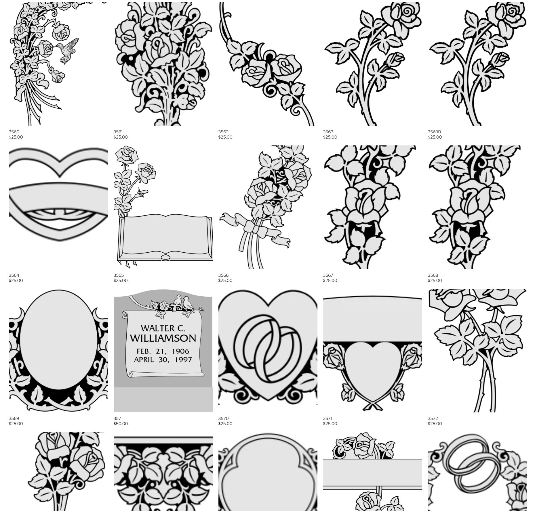 We currently have over 17,000 layouts and pieces of clipart ready to sandblast. We also have 1,000+ items in our etching library.